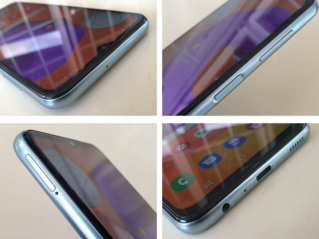 On the top corner you have a triple camera setup with led flash housed in a rectangular shaped camera module and below at the center a Samsung logo can be found. There’s a slight protrusion on the camera but gets less wobbling when placed on a flat surface or table.