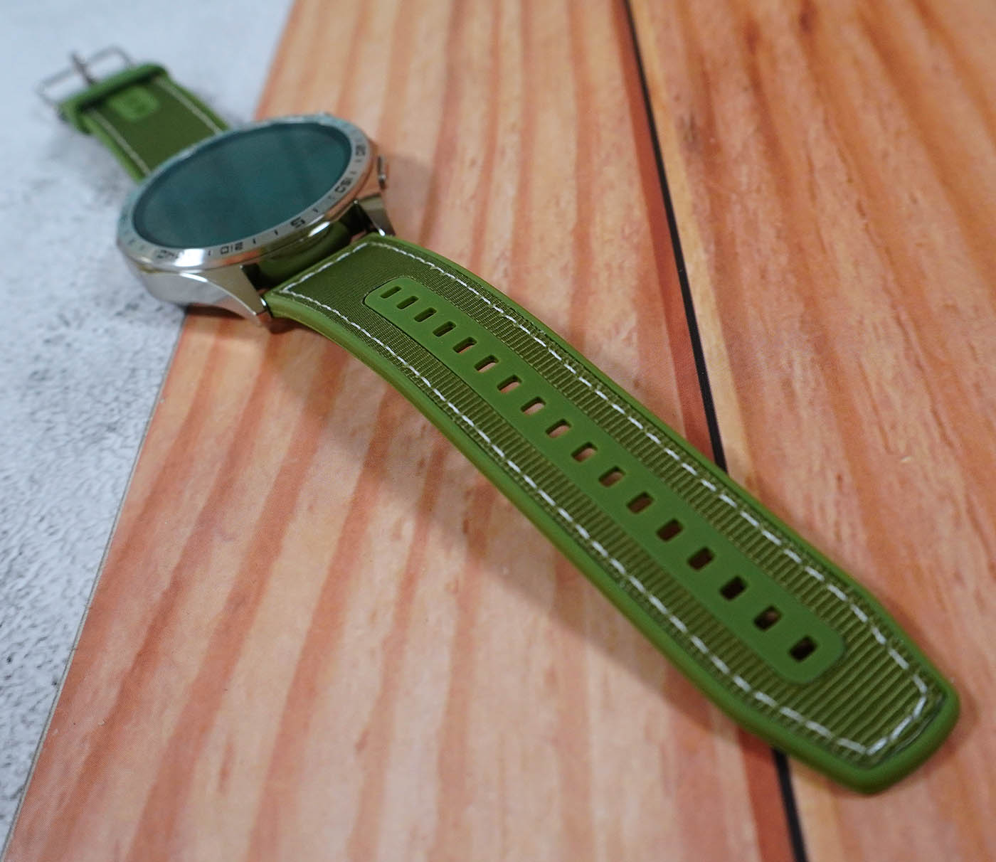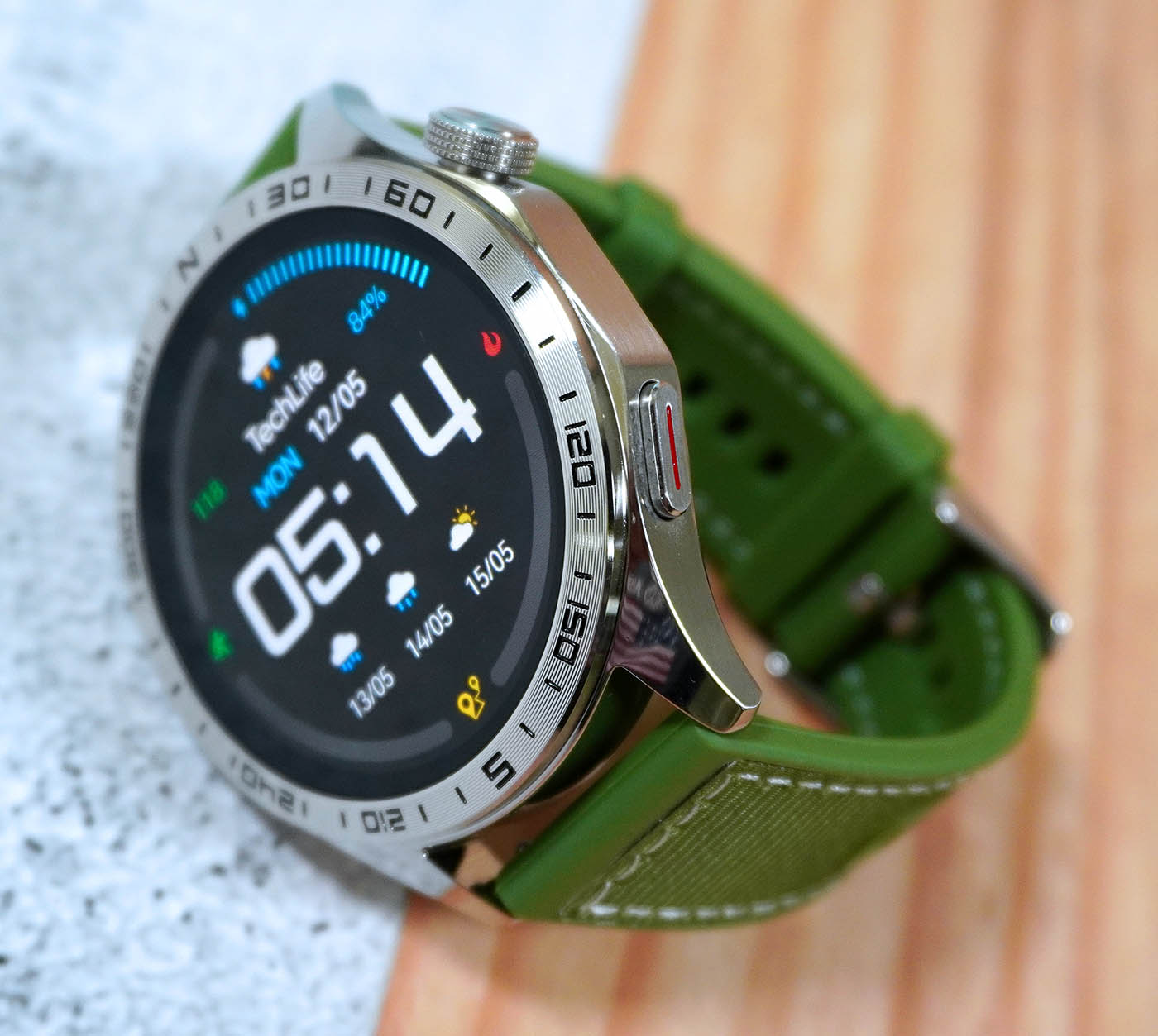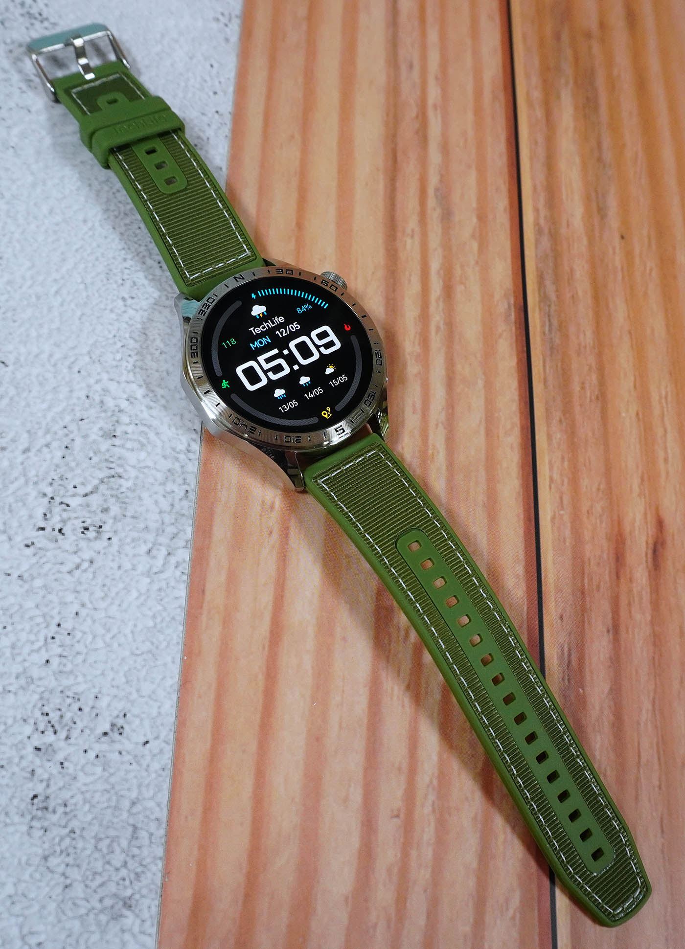 Wearing the TechLife Smart Watch P1, we can’t help but notice how much it stands out from its military-inspired design down to the polished silver metal finish. The green strap adds a nice touch, complementing the rugged-yet-premium look. We’re also excited to try out different strap styles or colors to switch things up and match our daily outfits.