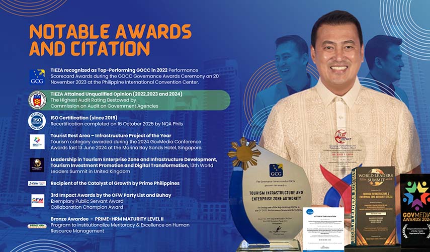 TIEZA’s institutional reforms have been recognized nationally and internationally. In 2024, the agency received the Civil Service Commission’s Bronze Award (Level 2 PRIME-HRM) for organizational excellence and achieved ISO 9001:2015 recertification, reinforcing its culture of transparency, accountability, and continuous improvement.